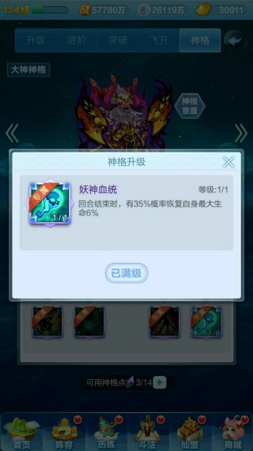 妖神血统:每回合结束,有35%的几率回复6%的最大生命,数值上看着还行,实际对战不知道效果怎么样