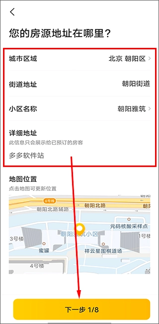 3、若想自助发布房源,需先选定房源的详细地址,填写城市区域、街道地址、小区名称及详细地址等信息,然后点击下一步。