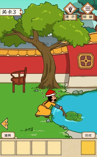 第3关:踩上椅子到树上获得一个树枝,用树枝在荷塘中获得荷叶。