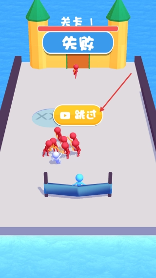 3、若游戏失败,可选择观看广告【跳过】重新游玩,也可以优化弹射的角度与力度,以此提高获胜几率。