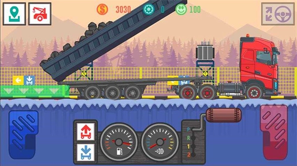 2、点击启动按钮,挂挂上相应的档位,点击加速踏板,在此过程中,你必须要熟练掌控车速以及上坡时候的档位调节,才能成功将运货成功。
