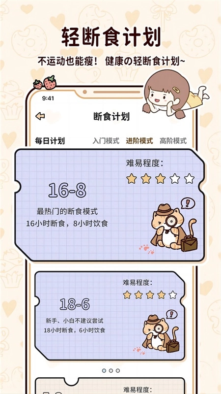 喵喵轻断食涵盖当今热门的多种轻断食计划,根据你录入的信息,推荐简单、实用的轻断食计划,在断食过程中给你提供记录追踪的功能。坚持下去,达到你的目的!