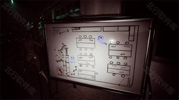 2、打开美容教室后门时遭遇人偶追杀,此时迅速躲藏至桌子底下,根据白板上的提示可知钥匙的藏匿地点。