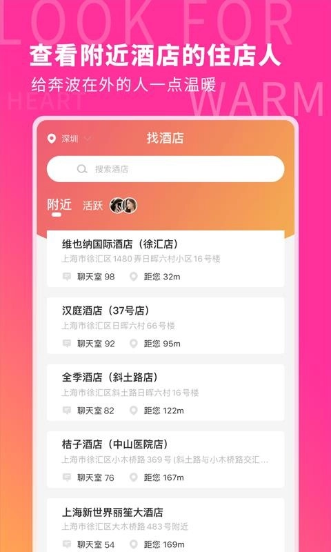 创新地将酒店住宿与社交相结合,以地理位置和酒店为纽带,精准连接同酒店的用户,打破了传统社交软件的限制,为用户提供了全新的社交体验。
