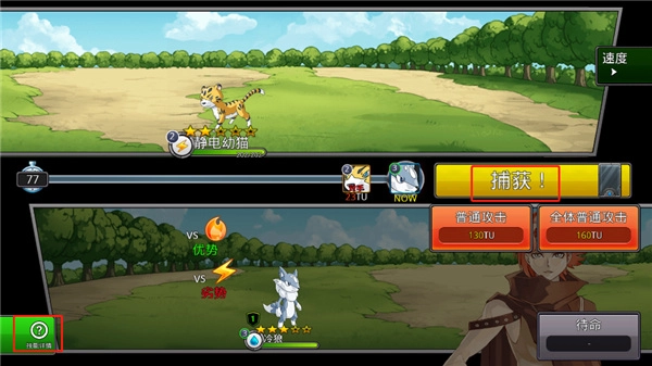 5、沿着主线继续前行,抵达森林。要是遇到静电幼猫,点击“捕获”按钮开启捕获操作。要是玩家不清楚自己搭档怪兽的技能,可点击右下角的“技能详情”,以此了解其基本技能。