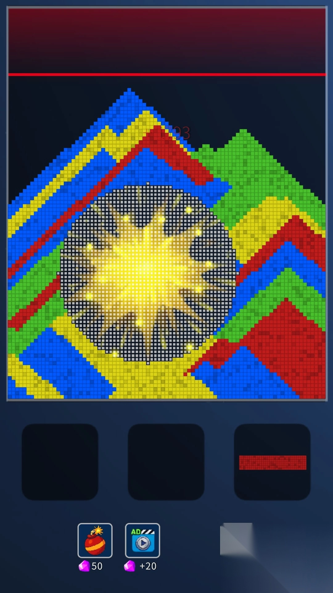 2、游戏的核心玩法为同色消除。当同色沙线把整行网格填满时,该行的方块就会被消除。方块消除后,上方的方块会受重力影响而下落,填补产生的空缺。