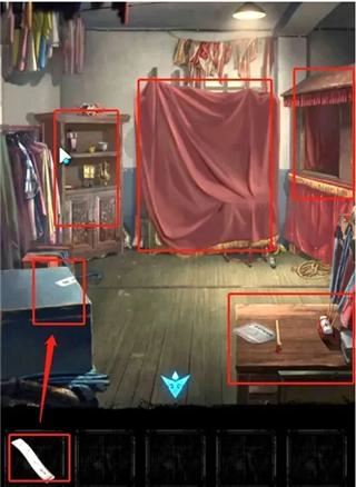 10、拉开中间布帘,可以看到乐器,拿起小棒子,按照报纸上的提示按顺序敲击即可。成功后,衣箱打开,得到布偶。