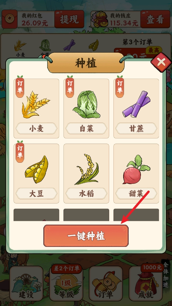 2、在种植界面会标识出订单所需的作物,点击即可种植,也可以选择一键种植。
