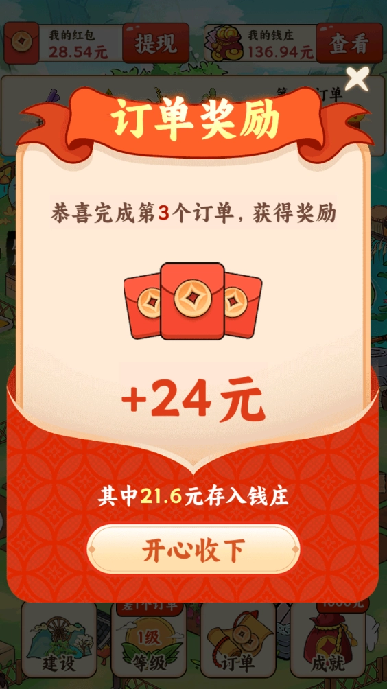 真的能够兑换!游戏里的红包获取途径为完成订单或者观看广告。前期大概完成4个订单,就能把自己的红包积攒到30,接着按照百分之一的比例来兑换,这样就能达到最低提现门槛0.3啦,小编亲测,提现秒到账哦!