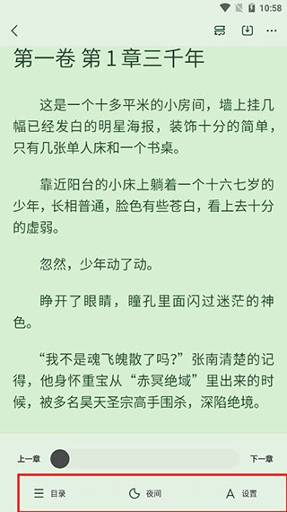 4、当轻轻触碰屏幕时,屏幕底部就会呈现出目录、夜间模式以及设置等功能选项。