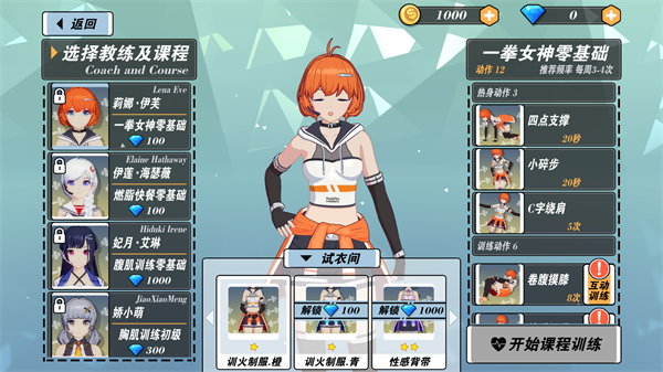4、点击训练,在左侧可以选择自己喜欢的教练,右侧则是训练的课程,有些课程及角色是需要使用钻石或金币进行解锁。