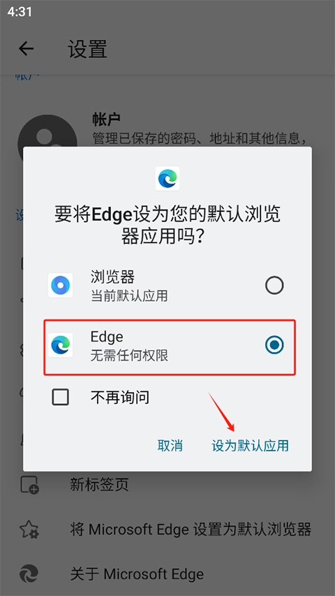 3、选择将edge设为默认浏览器选项