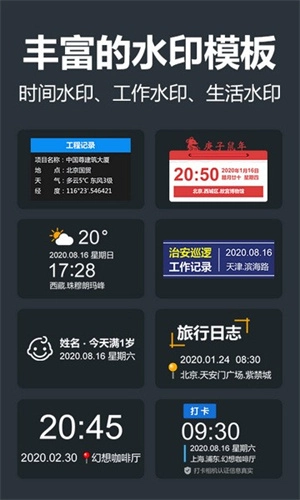 这款软件能在多种场景下使用,像日常打卡、旅行纪念之类。而且它拥有丰富的水印模板,涵盖天气、经纬度、电子时钟、工程以及执勤水印等,能全方位满足用户的个性化需求,让照片内容变得更加生动有趣。