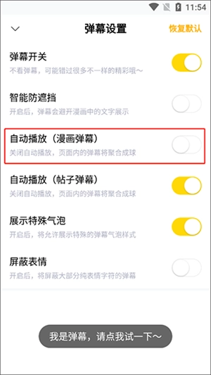 5、进入弹幕设置界面后开启“自动播放”开关,即可实现弹幕自动显示。