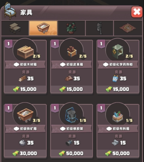 5. 店内资源箱分配,前期建议摆放4种货架每种一个,剩下的 铁、木、皮、化学各3个。