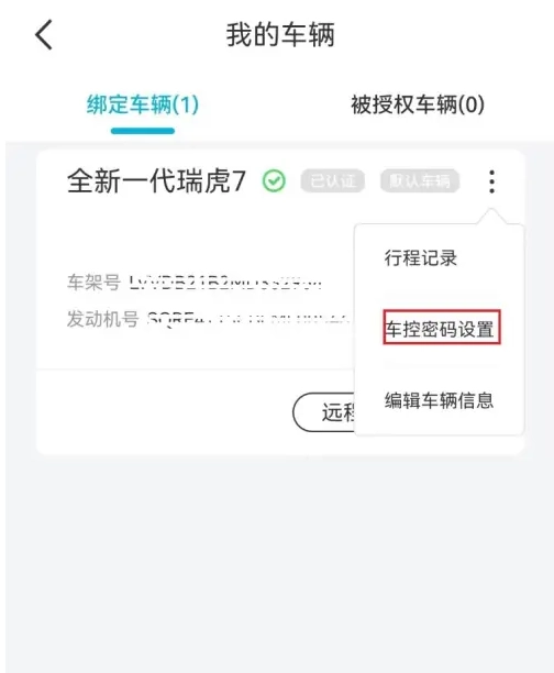 2、进入后点击右上角的竖3点,打开;选择“车控密码设置”
