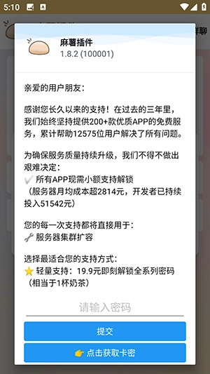 麻薯插件是一款专门面向吃鸡玩家打造的游戏辅助应用程序。首次使用时,需先允许其显示在其他应用上层。待启动游戏后,就能运用麻薯插件的内存功能与安全功能,诸如人物上色、两倍视野、人物加速、秒开倍镜等功能均可使用。不过,美中不足的是,使用该插件需要付费获取卡密,大家可依据自身需求,自行决定是否付费来得到卡密。