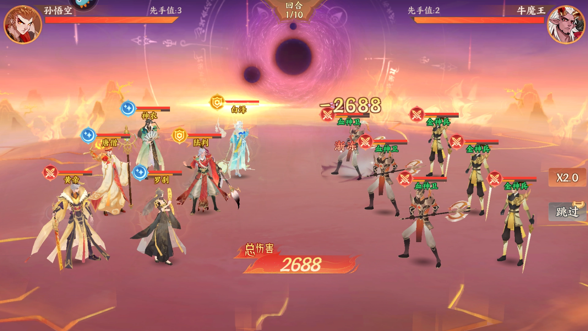 九龙腾飞:对敌方2名生命值最低的神灵造成190%物理伤害,同时增加1层【灼烧】(2回合)。