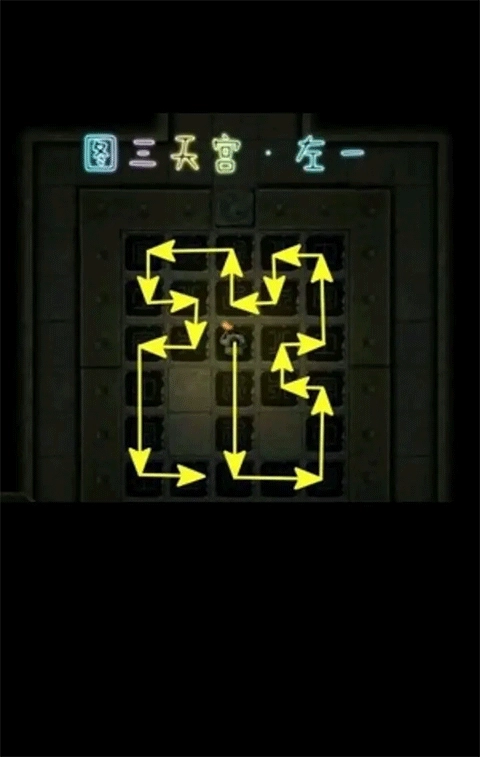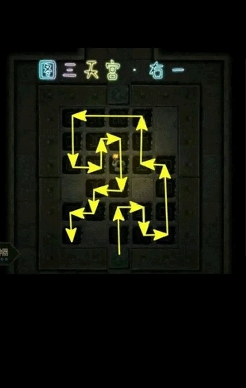 4、石像房间:此房间内有两个将军石像与四个圣兽石像,它们的作用均为开路。进入房间后,建议优先处理其中的踩石板机关。存在石板的区域,属于无暗雷区域,玩家可放心踩踏。不过,房间内的小房间以及塌陷神秘区域依然存在暗雷,需多加留意。踩石板遵循老规矩,即踩亮后不要走回头路,这里附上相关图片供大家参考。【特别说明:不一定要从入口开始踩并在入口结束,玩家能够从任意位置开启踩踏,只要往回走一步,整个石板状态就会全盘重置,因此完全可以从单独的一个分支重新开始踩。】