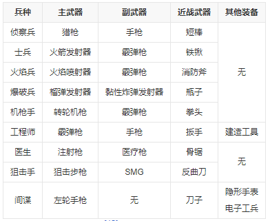 武器是在战斗中使用的物品,并可以用来执行特殊的嘲讽动作。每种兵种至少拥有三种基础武器:兵种独有武器、副武器、近战武器。