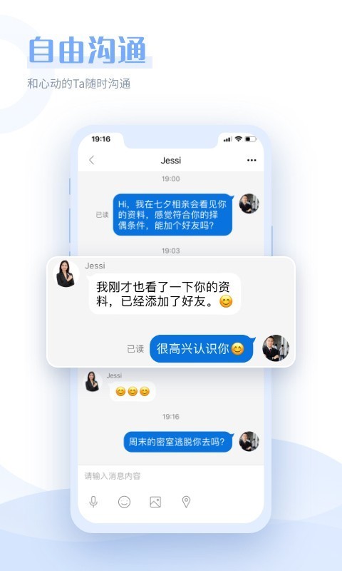 通过智能算法提升你的交友效率,这是一个集高效匹配聊天、附近交友、趣味约会和真挚恋爱于一体的社交平台。