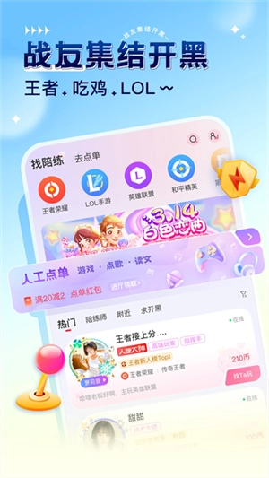 这款平台聚焦于游戏陪玩、团队竞技、语音互动等核心功能,吸引了大量游戏达人、电竞高手和才艺主播入驻成为服务者。用户能够在这里找到合适的伙伴一起体验游戏乐趣。
