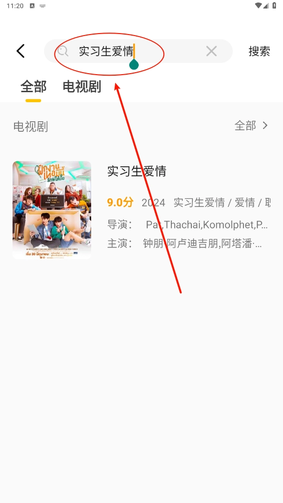 3、通过顶部的搜索栏输入关键词,如“实习生爱情”,精准查找目标剧集。