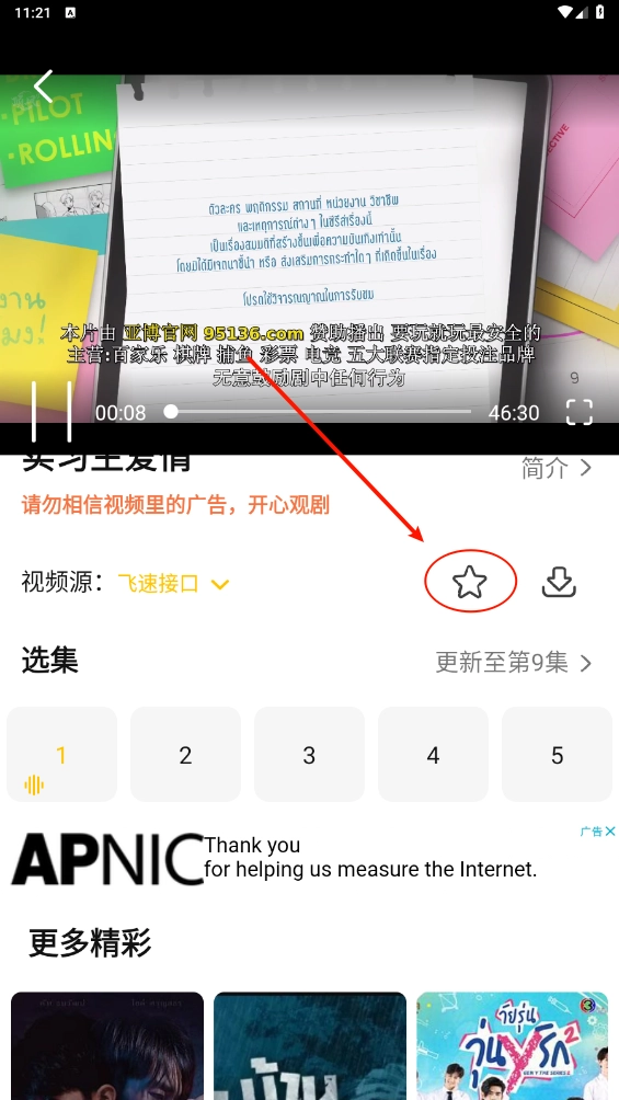 4、点击选中的剧集直接进入播放页面,同时还能点击收藏按钮将喜欢的剧集保存到个人列表中。