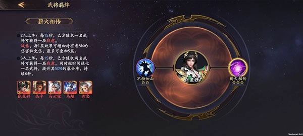 选定三位羁绊角色后,其余两个位置可加入强力武将,例如赵云、吕布、貂蝉、孙策、张辽等输出型角色,亦可加入华佗、蔡文姬等治疗型辅助。除吕布与貂蝉外,其余大多可通过小氪或白嫖获得。
