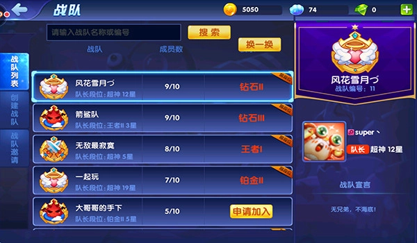 2、战队页面会展示当前所有可用战队的信息,包括图标、名称、人数及队长段位等。如果有开放招募的战队,可以直接点击申请加入按钮提交请求,等待队长审核通过。