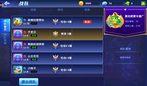 3、成功加入战队后,就可以查看该战队的详细信息,像成员的在线状态、段位等级之类的都能看到。要是想自己创建战队,也能在创建战队的页面设置专属的名称、宣言和图标,不过需要消耗100绿钻或者200彩贝。这些货币通过参与日常活动积累就能比较轻松地获得。