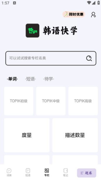 1、打开软件可以看到许多韩语的词库和语法