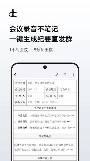 1、会议记录整理:无论是商务会谈还是团队讨论场景,都能自动转写现场的发言内容,进而快速产出条理清晰的会议纪要,有效防止关键要点被遗漏。