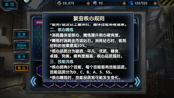 首先,使用低级破损核心或晶体合成初级小核心,一般5个20级破损核心可合成一个37~38级的小核心。建议先制作出5个小核心,再利用剩余材料进行精炼。建议精炼至65级左右,继续提升难度会大幅上升,反而浪费资源;若精炼太低则需要更多催化剂来制造核心,也是一种浪费。因此65级是一个性价比较高的目标。