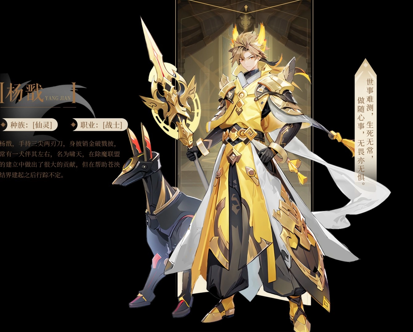 杨戬,手持三尖两刃刀,身披销金破披常有一犬伴其左右,名为啸天,在除魔联盟的建立中做出了很大的贡献,但在帮助苍泱结界建起之后行踪不定。
