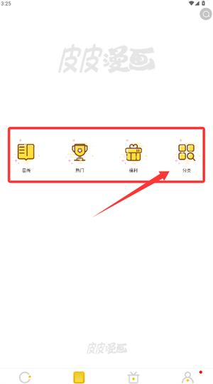 2、用户可以在引导页面点击立即体验按钮,即可跳转至皮皮漫画的软件主界面。