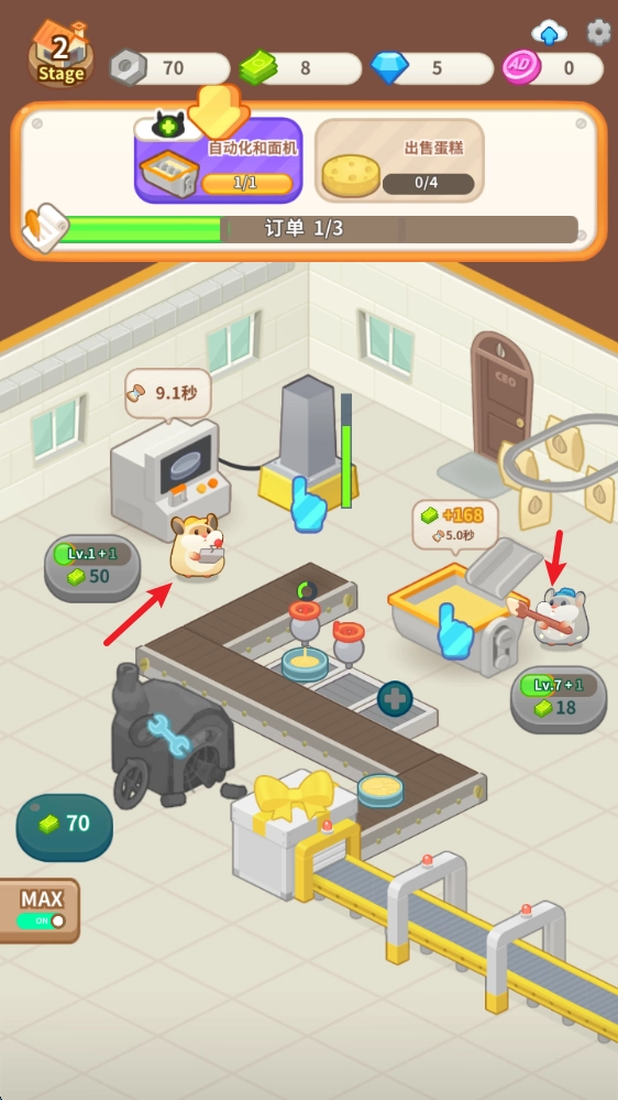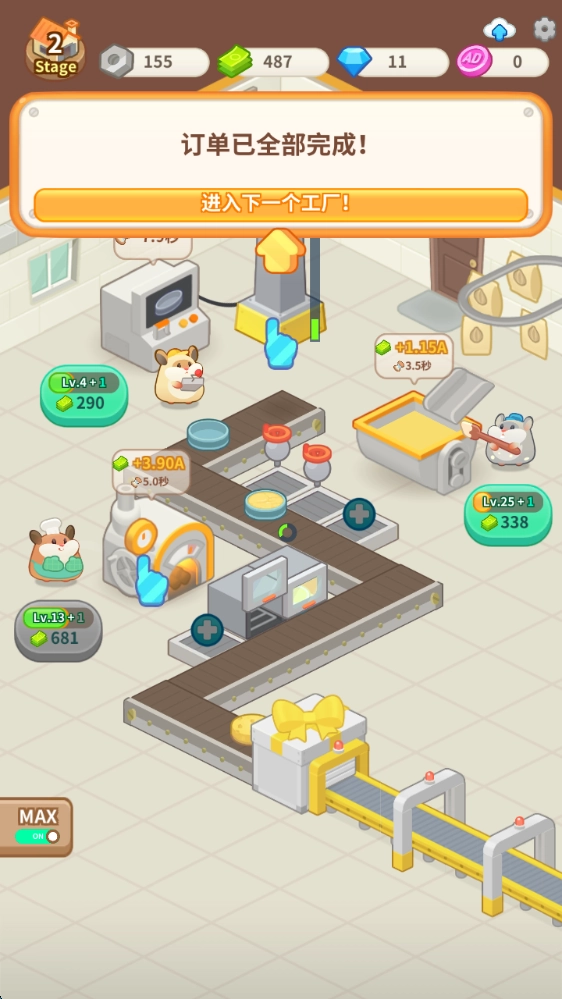 1、打造并升级各类机器,为其配备合适的仓鼠经理负责管理,以此达成蛋糕制作的全自动化流程,从而承接并完成更多订单。