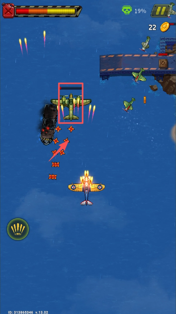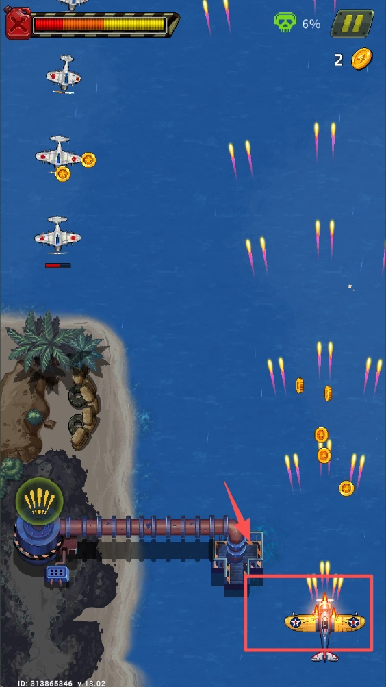 游戏操控采用“虚拟摇杆+按键”组合:左侧摇杆负责操控战机的飞行方向,右侧摇杆用来调整射击角度,技能按键则可释放导弹与炸弹。当遭遇敌机弹幕攻击时,可借助“快速侧翻”(双击方向键)和“俯冲规避”(向下滑动屏幕)的操作来躲避密集的子弹;还能利用“云层掩护”(飞入云层所在区域)暂时隐藏机身,以此摆脱敌机的追击。当能量不足(导弹、炸弹消耗殆尽)时,可切换至机枪进行持续输出,同时留意战场中随机掉落的“补给箱”,它能补充弹药并恢复血量。