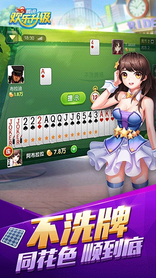 该游戏以四人两两组队的形式展开,通过抢分实现升级目标,基本规则与传统“升级”相似,但更具对抗性和策略性。在保留原有优点的同时,牌数从54张增至108张,取消了底牌压分限制,使牌型变化更加丰富。新增的“对牌”、“拖拉机”等出牌形式以及“双抠翻倍”等规则,极大增强了游戏的趣味性和紧张感。此外,欢乐升级还融合了炒地皮玩法,在反主和反底环节中引入翻倍机制,让比赛过程更刺激精彩。