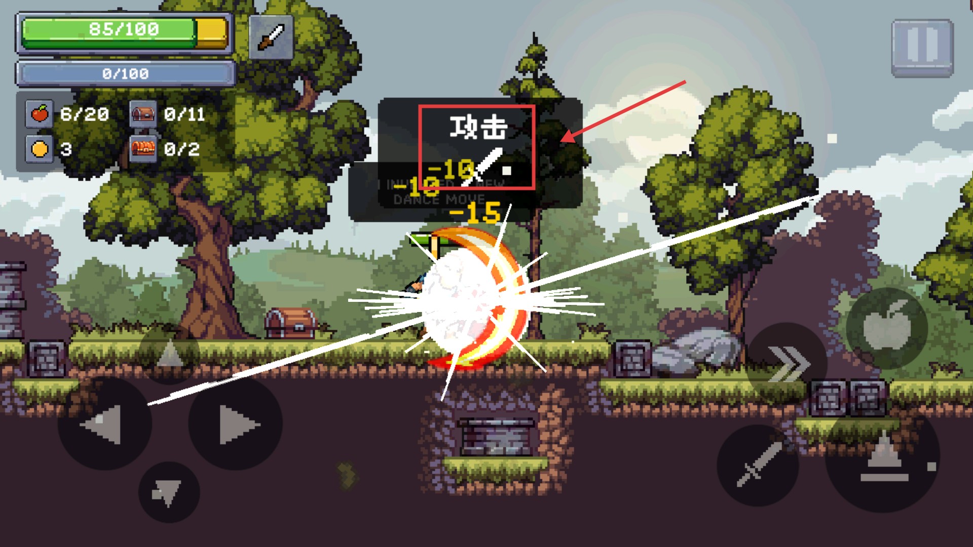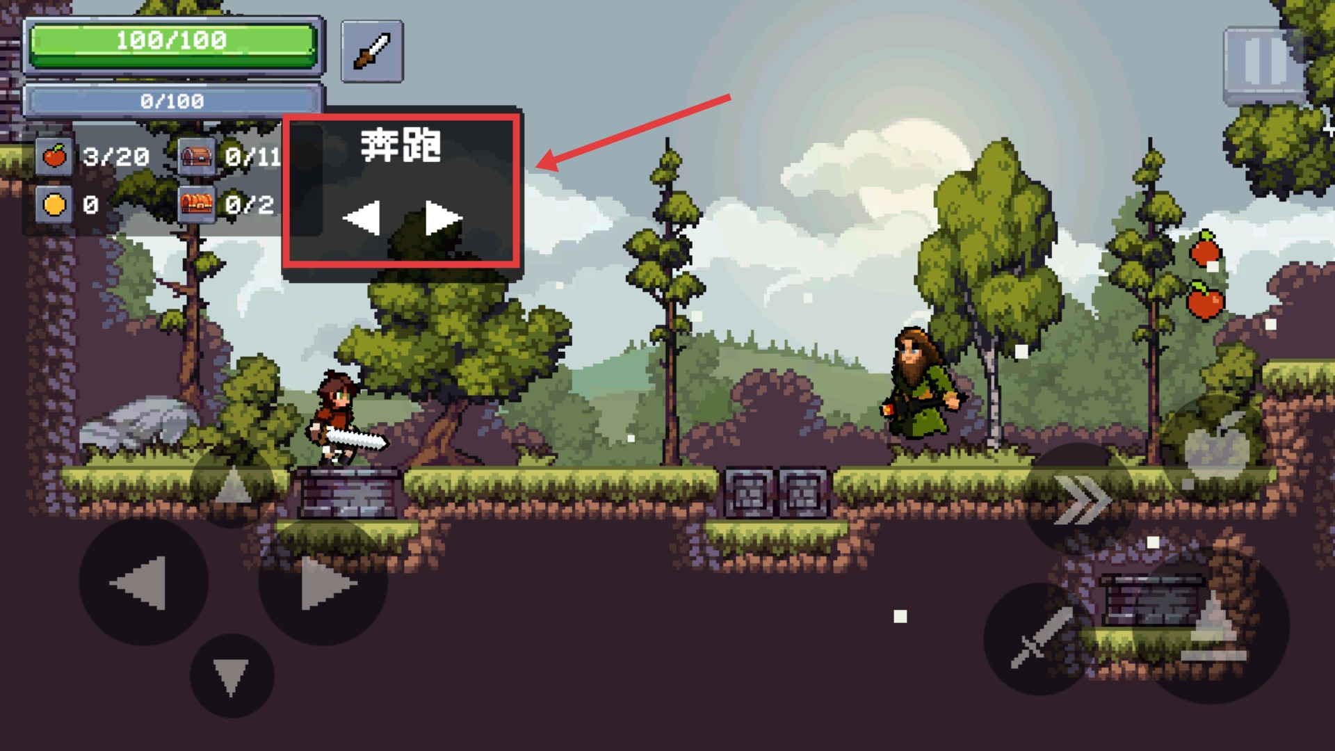 3、遇到高处或空中敌人时,点击【跳】按钮跃起躲避攻击,同时收集空中苹果资源,增强续航能力。
