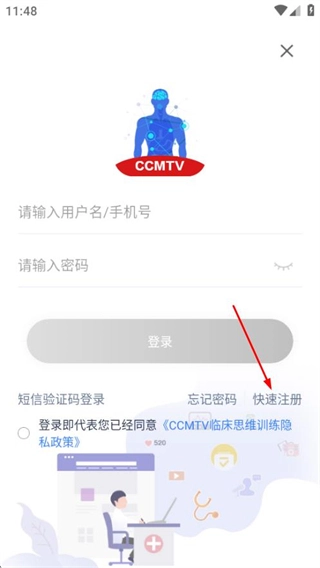 3、在登录页面,点击快速注册选项,进入注册页面。