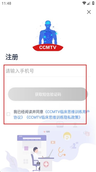 4、在注册页面,填写信息并勾选协议,进入验证码填写页面。