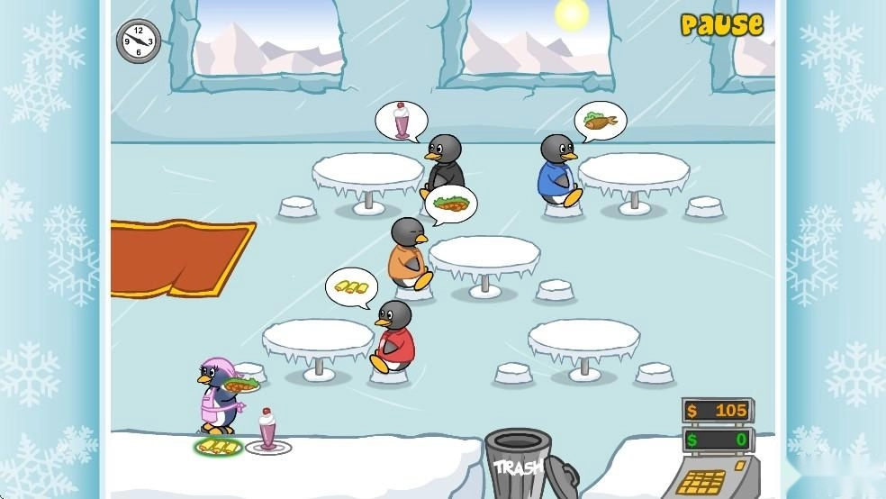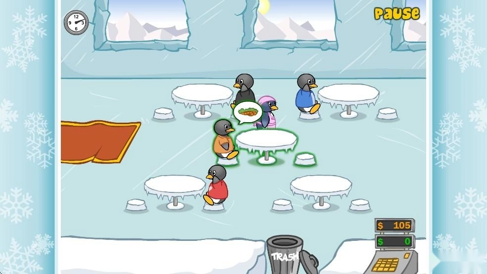 3、进入游戏后,将企鹅顾客分配到空桌上