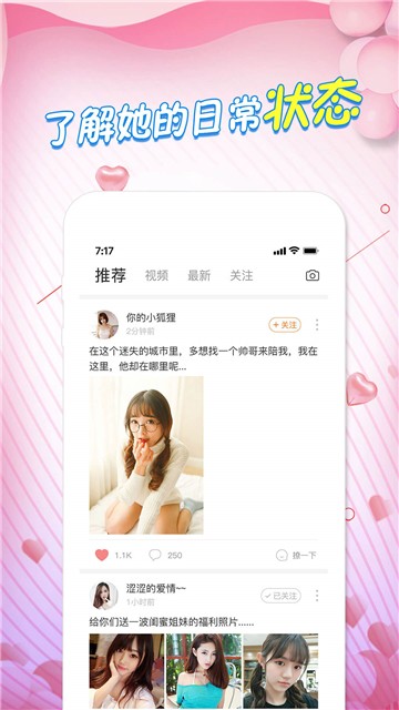 爱遇官网版,邂逅欣赏自己的陌生人,融合聊天、约会、相亲、约见、附近人、同城相遇、甜蜜恋爱等功能,深受青年男女喜爱。在这里,你能随时随地与附近高颜值的陌生TA进行一对一的亲密视频语音聊天,探讨交友约会。平台上的小姐姐和帅哥都经过严格的人工视频审核,真实可信,让你安心畅玩。