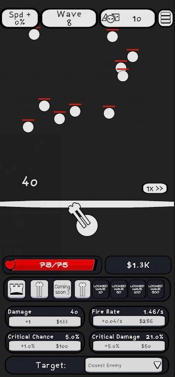 2. 过了第10关,敌人强度会急剧增加,此时建议留存一部分金币,以便在紧急时刻用于升级。优先考虑提升射程和攻击速度。