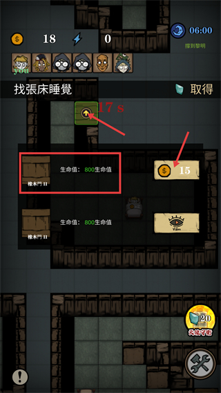 3、收集界面中的【15】金币,利用移动箭头探索区域,遇到【橡木门II】需注意其【800生命值】的防御属性。