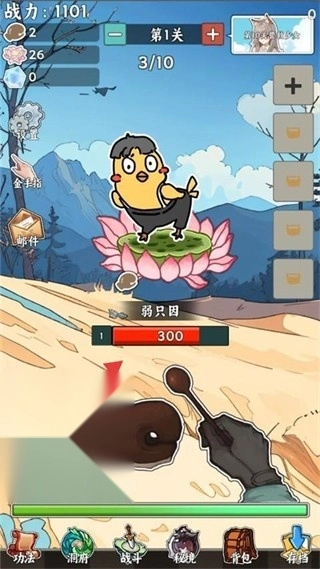 3、战斗界面中敲击木鱼对小怪【弱只因】造成伤害,积累足够伤害击败它来推进关卡进度。