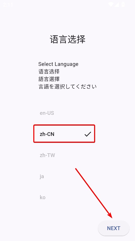 1、安装完成后打开应用,选择语言为zh-CN,接着点击NEXT按钮