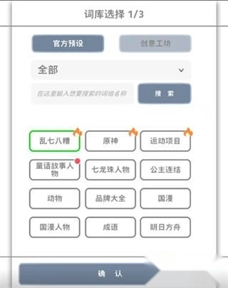 现在这个版本里,当你点击“词库选择”,会弹出一个界面,把预设的所有词库和创意工坊里的创作词库都展示出来,这样词库的展示更全面也更清晰,方便大家挑选自己喜欢的词库。