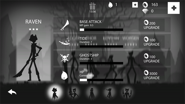 1、进入游戏后会出现五位不同的火柴人,除了第一位初始火柴人之外,剩余的需要利用金币和砖石来进行解锁;